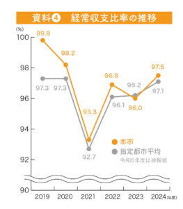 2024年度決算は4年連続で大幅な黒字に。市税収入が増え、基金は増加し、市債も減少、財政は健全と言えます(資料①②③)。しかし、経常収支比率は、23年度の96 .0%から97 .5%に悪化。改革プラン第2期を策定する根拠となった22年度の96 .9%よりも高く、第2期を前倒しで廃止する理由とした指定都市平均を再び上回りました(資料④)。第2期の策定は必要だったのか、廃止の判断基準や時期が適切と言えるのか疑問です。