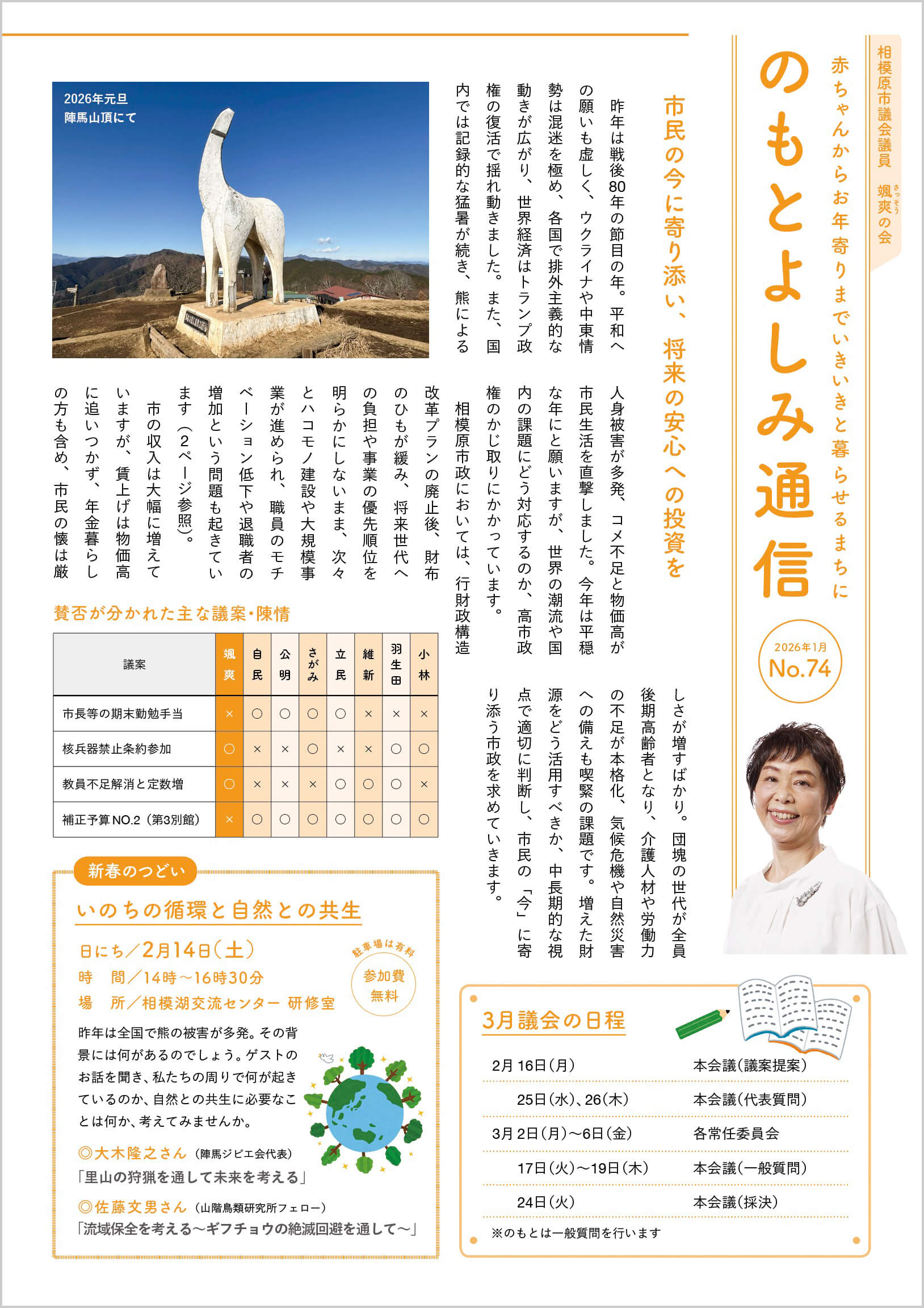 のもとよしみ通信 No.74 (2026年1月) 市民の今に寄り添い、将来の安心への投資を 3月議会の日程 いのちの循環と自然との共生 12月議会 代表質問 民生委員会 二転三転するハコモノ建設 なぜ公共でアイススケート場!? 新設の衛生研究所 十分検討を 小原の郷 赤字補填が前提!? 多様な学びの機会の保障を 学びの多様化学校設置へ 日本語の習得 支援の充実を 物価高対策 子ども1人2万円 中山間地域の移動手段の確保を 交通弱者の移動手段の確保を 実現しました! 「さがみはら子どもの 権利の日のつどい」開催(11/22) リユース容器の使用(11/30) 学びの多様化学校 並木小跡地に設置へ 学びの多様化学校 並木小跡地に設置へ PDFをダウンロード 詳しく見る